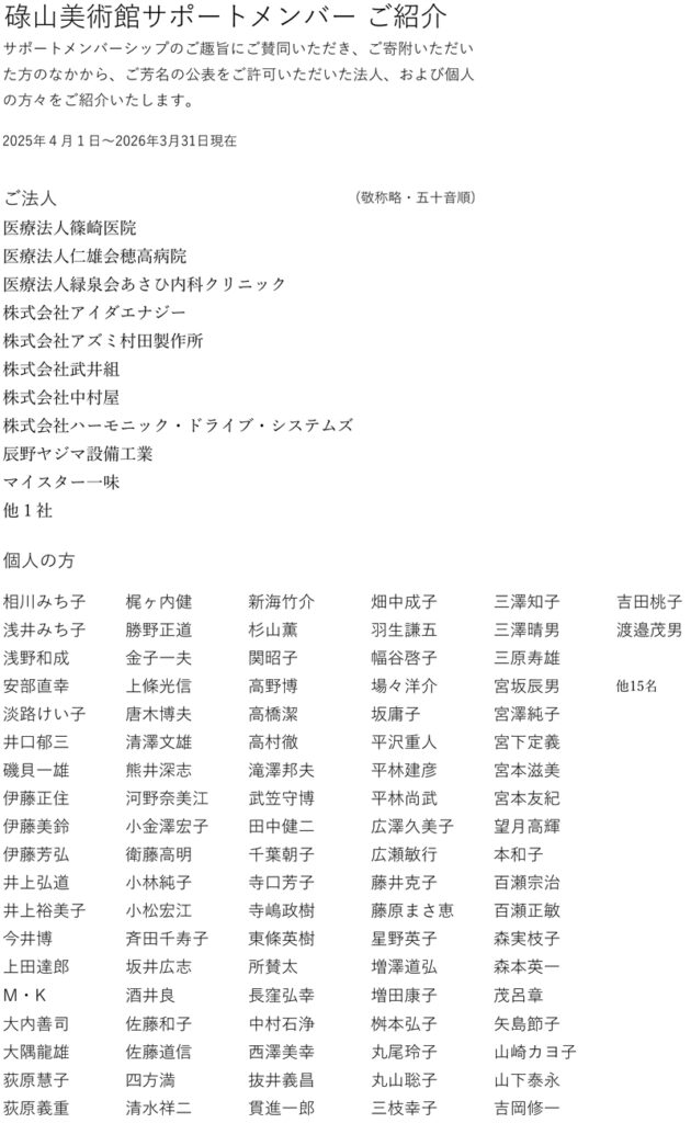 サポートメンバーシップのご趣旨にご賛同いただき、ご寄附いただいた方のなかから、ご芳名の公表をご許可いただいた法人、および個人の方々をご紹介いたします。2025年4月1日~2026年3月31日現在