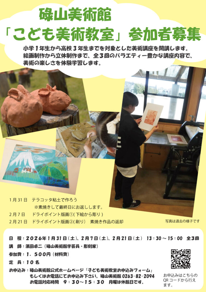 1月31日 テラコッタ粘土で作ろう ※素焼きして最終日にお返しします。2月7日 ドライポイント版画①(下絵から彫り)2月21日 ドライポイント版画②(刷りから完成) 素焼き作品の返却